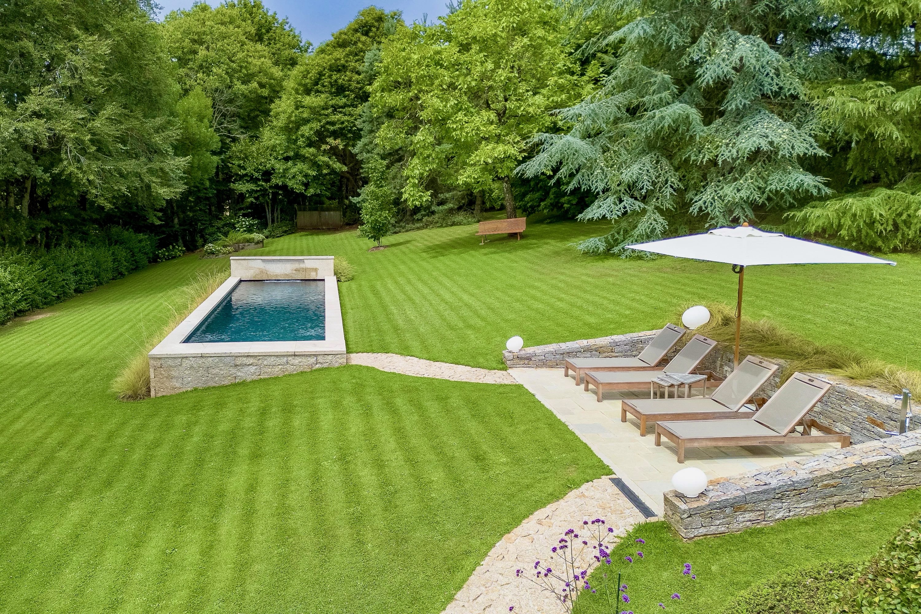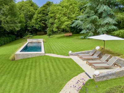Jardins exceptionnels dans leur conception et entretien, avec superbe piscine en granit .