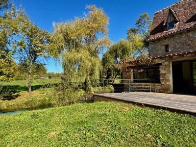 Ravissante maison en pierres , ancien moulin, datant de 1800 , restaurée en 2015, charme fou, sur un terrain de plus de 1 ha 2, avec jacuzzi . Environnement exceptionnel, rivière, bief en piscine naturelle, beau terrain . La maison d'env 117 m2 se compose d'un séjour de 37 m2 ,parquet, poutres, pierres apparentes, cuisine équipée, rangements, donnant sur une immense terrasse de 33 m2, cheminée cantou avec insert, double vitrages, au dessus une chambre 17 m2, rangements, salle de bains 7 m2, ravissant "bolet", en rez de jardin une grande pièce chambre salon de musique 25 m2 rangements, salon donnant sur une belle terrasse arrière 24 m2, terrasse 36 m2 ouverte sur la nature et le bief, salle d'eau douche italienne, 10 m2 .